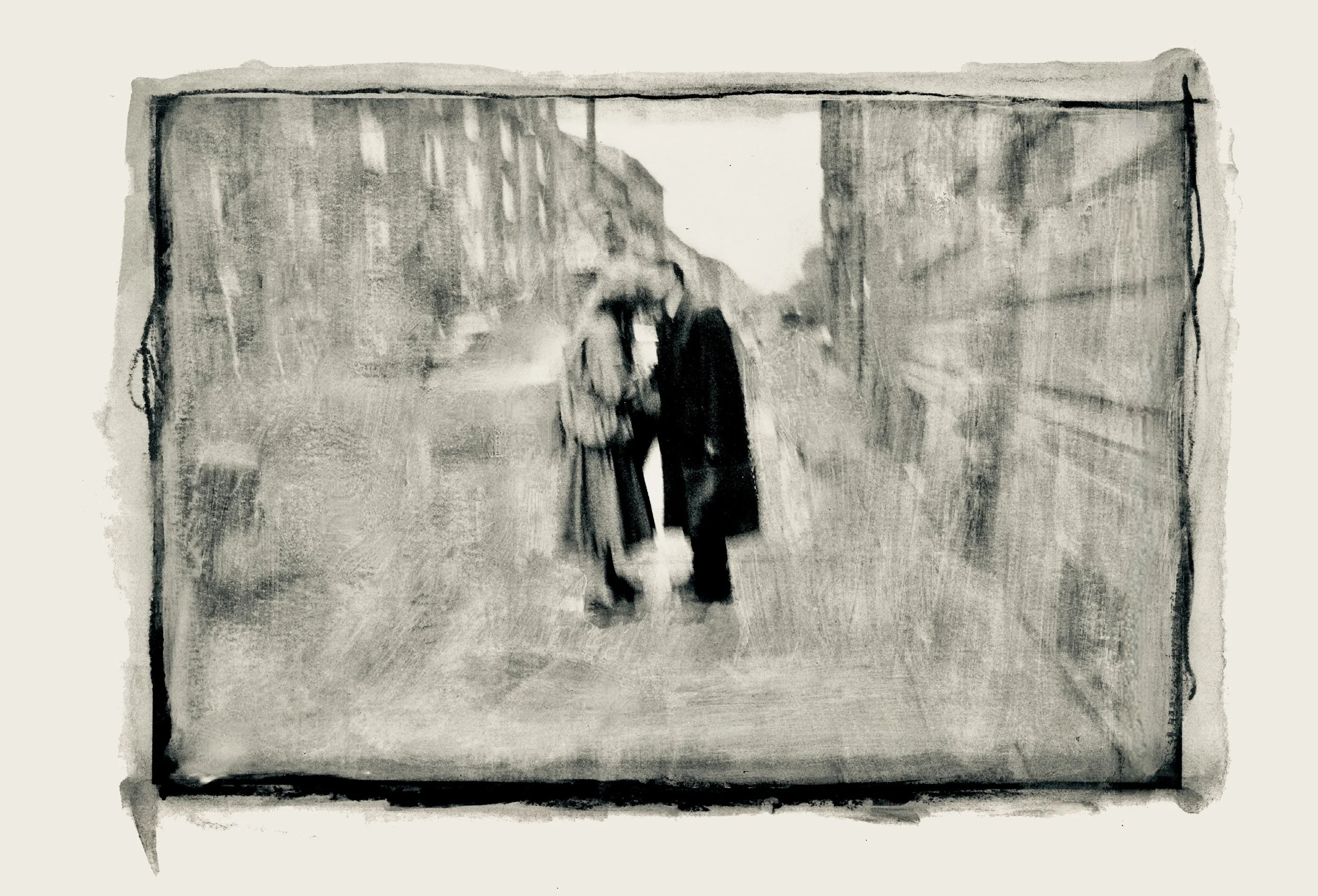 Then he saw something else that held him still. Outside he watched a man and a woman on the pavement walking toward each other. He in a heavy coat, she with a bag swinging at her side. They met, smiled and kissed, their bodies folding into one another, an extraordinary moment of warmth in a world growing colder by the day.